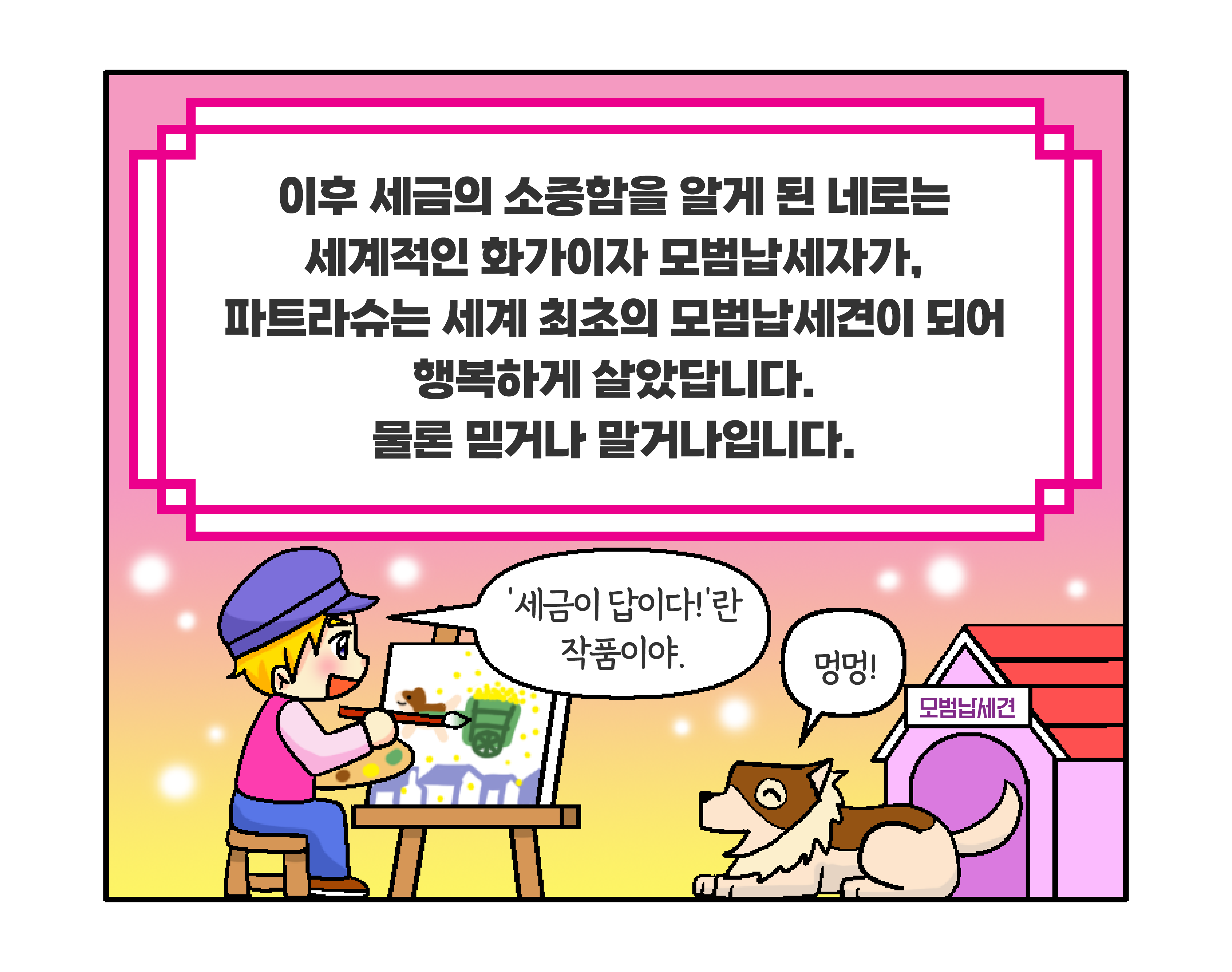 세금이 진범을 잡아줍니다! 작성자 정보 국세청어린이신문 작성 작성일 2026.03.20 22:55 컨텐츠 정보 158 조회 목록 본문 네로는 어떻게 누명을 벗게 되었을까요? 관련자료 등록된 댓글이 없습니다. 로그인한 회원만 댓글 등록이 가능합니다. 목록