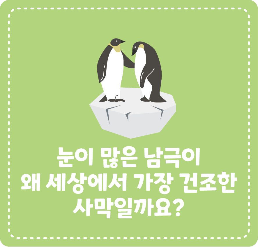 사막에는 물이 거의 없고 눈은 녹으면 물이 되니까 눈으로 뒤덮인 남극은 건조한 사막이 아닐 것 같은데요. 그런데 놀랍게도 남극은 지구에서 가장 건조한 사막 중 한 곳입니다. 사막에는 모래가 많다 보니 사막은 ‘모래가 많은 곳’을 뜻한다고 생각하는 친구들도 있을 텐데요. 사막을 정하는 기준은 모래가 아니라, 1년에 내리는 강수량에 따라 결정됩니다. 남극은 기온이 너무 낮아 공기 속에 수증기가 거의 없고 구름도 잘 생기지 않아요. 그래서 눈과 얼음이 많아 보여도 실제 강수량은 매우 적은 ‘얼음 사막’인 것이죠.