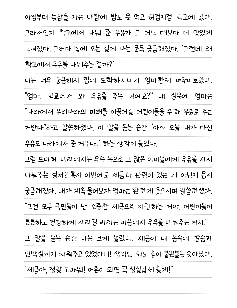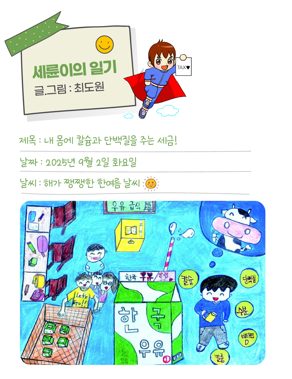 세륜이의일기 분류 내 몸에 칼슘과 단백질을 주는 세금! 작성자 정보 국세청어린이신문 작성 작성일 2025.08.29 22:27 컨텐츠 정보 157 조회 목록 본문 세륜이의일기 내 몸에 칼슘과 단백질을 주는 세금! 관련자료 목록