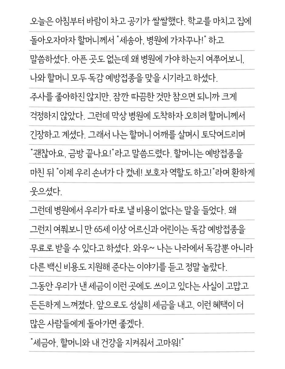 세송이의일기 분류 우리 가족의 건강을 지켜주는 든든한 세금 작성자 정보 국세청어린이신문 작성 작성일 2025.11.05 22:39 컨텐츠 정보 74 조회 목록 본문 세송이의일기 우리 가족의 건강을 지켜주는 든든한 세금 관련자료 목록