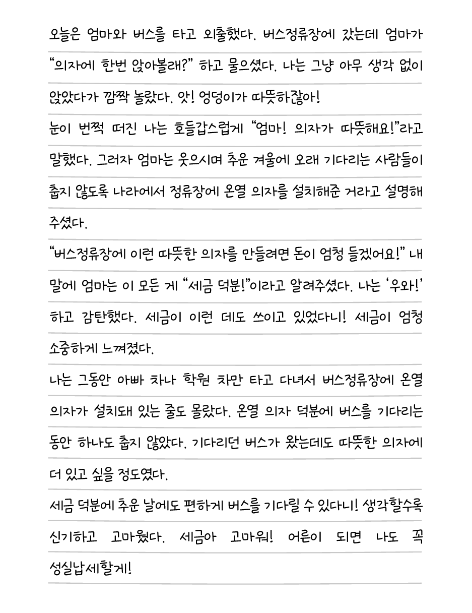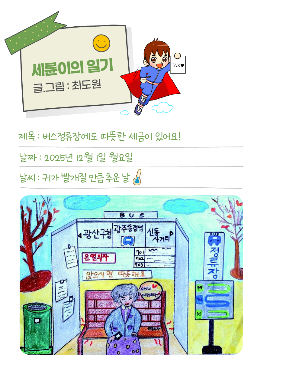 세륜이의일기 분류 버스정류장에도 따뜻한 세금이 있어요! 작성자 정보 국세청어린이신문 작성 작성일 2025.12.01 22:26 컨텐츠 정보 61 조회 목록 본문 세륜이의일기 버스정류장에도 따뜻한 세금이 있어요! 관련자료 목록