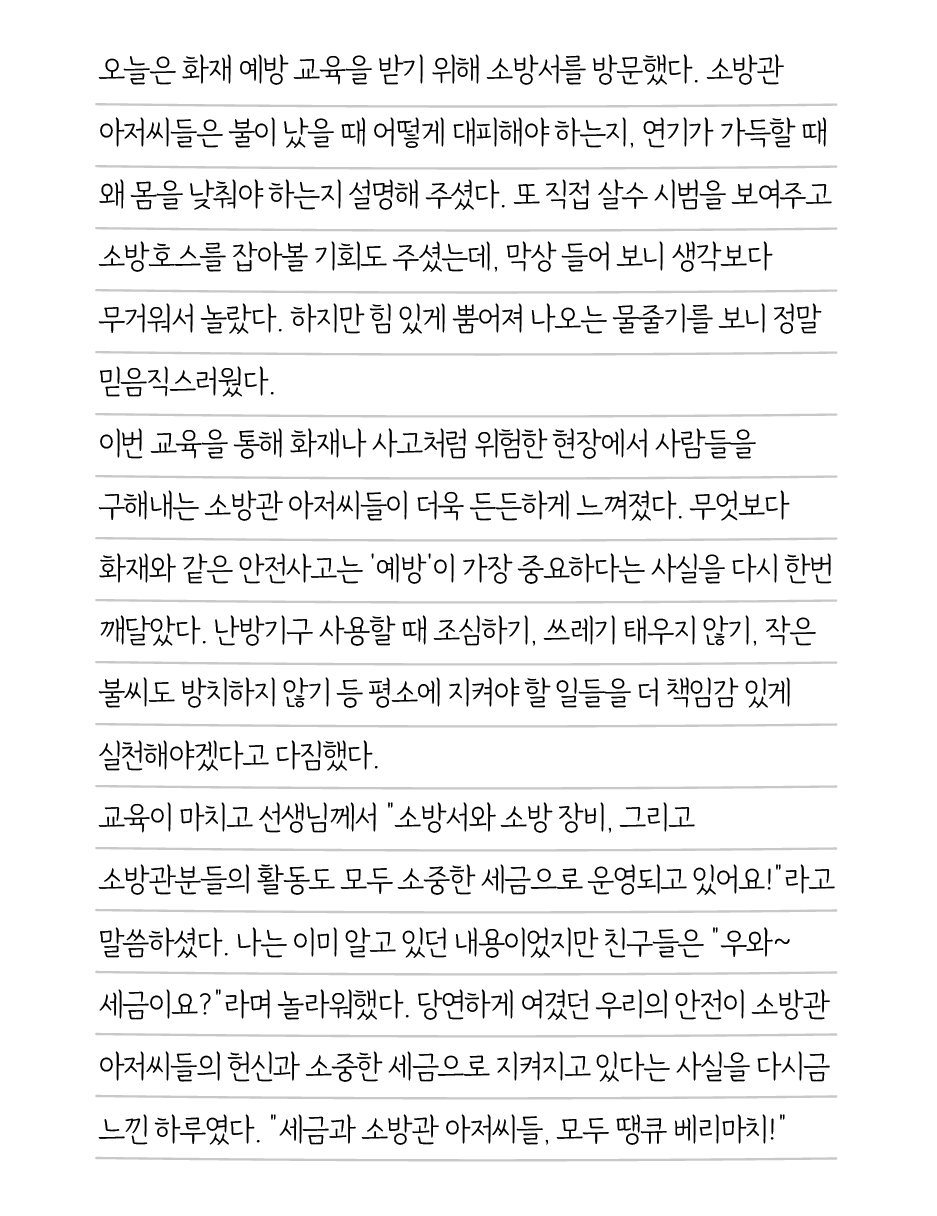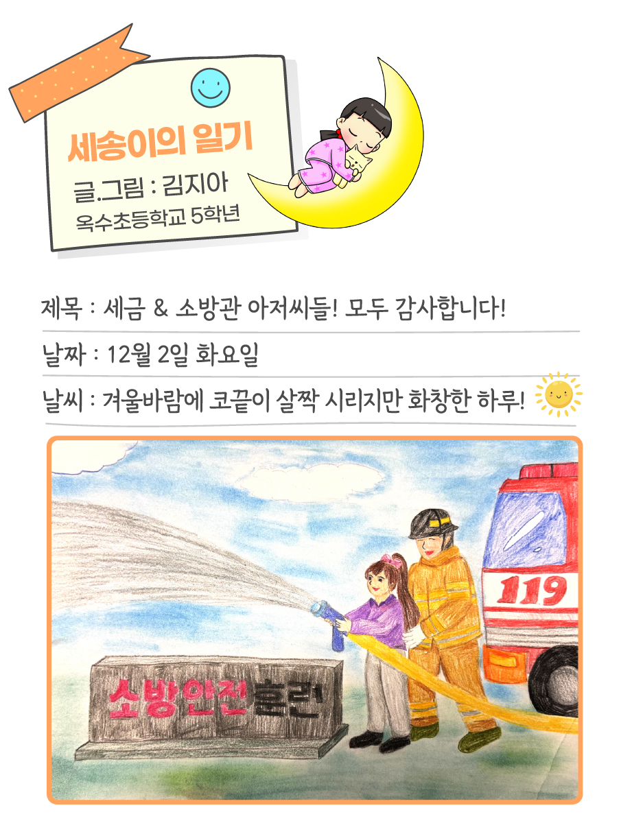 세송이의일기 분류 세금 & 소방관 아저씨들! 모두 감사합니다! 작성자 정보 국세청어린이신문 작성 작성일 2025.12.08 17:23 컨텐츠 정보 63 조회 목록 본문 세송이의일기 세금 & 소방관 아저씨들! 모두 감사합니다! 관련자료 목록