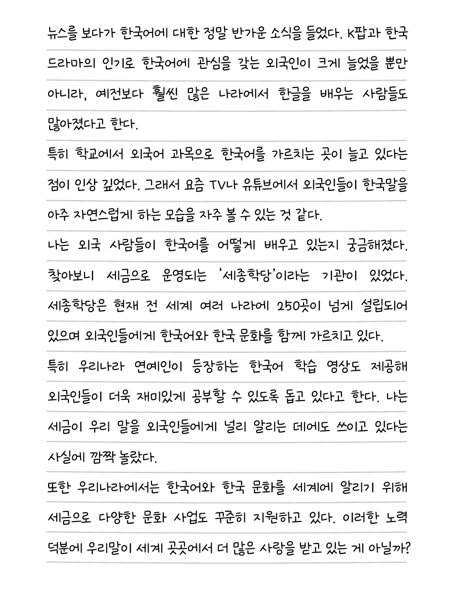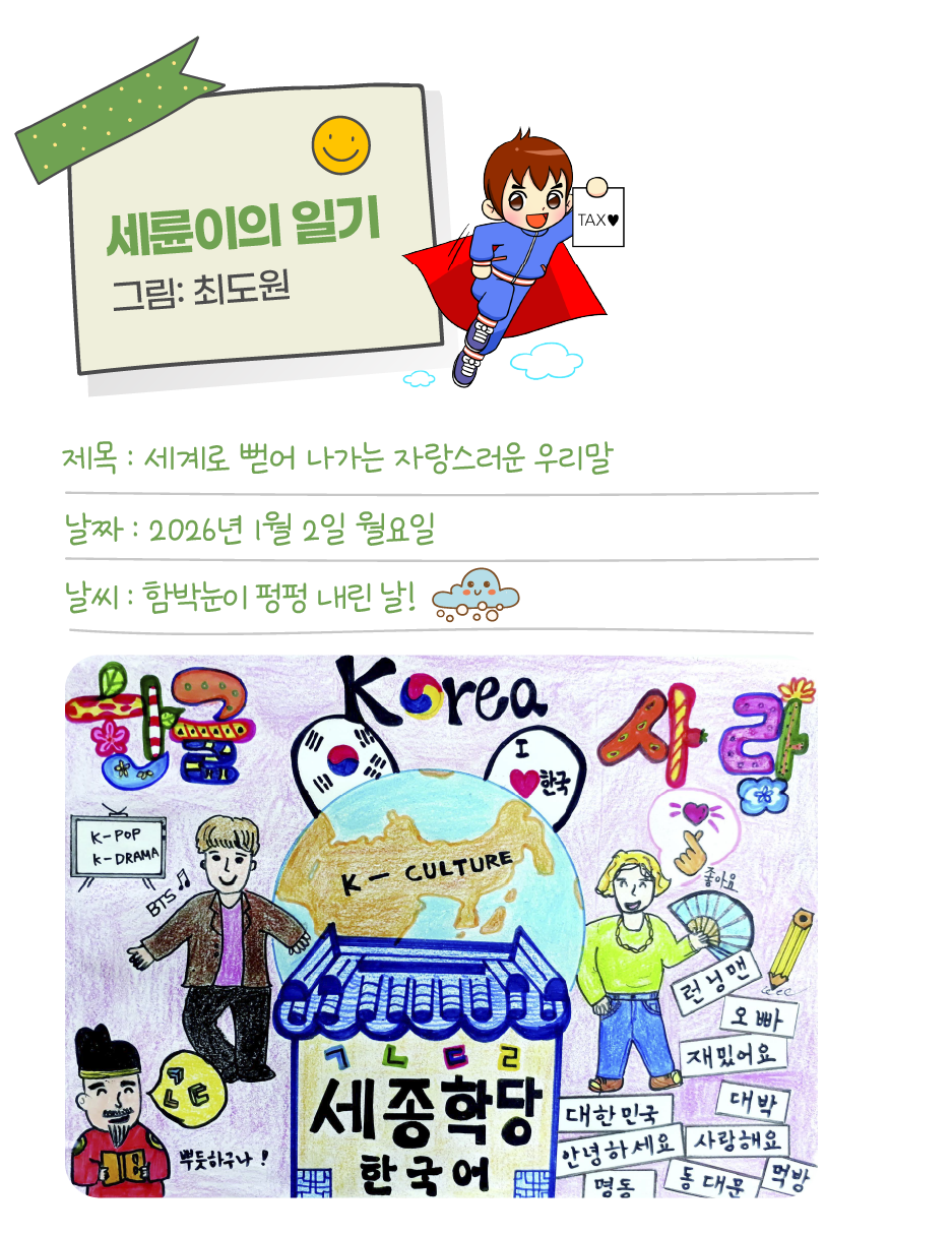 세륜이의일기 분류 세계로 뻗어 나가는 자랑스러운 우리말 작성자 정보 국세청어린이신문 작성 작성일 2026.02.02 21:29 컨텐츠 정보 65 조회 목록 본문 세륜이의일기 세계로 뻗어 나가는 자랑스러운 우리말 관련자료 목록