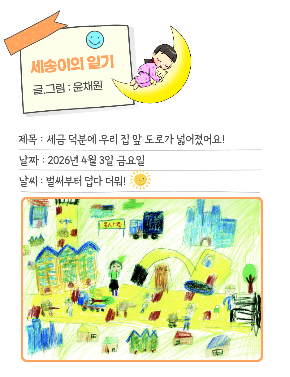 세송이의일기 분류 세금 덕분에 우리 집 앞 도로가 넓어졌어요! 작성자 정보 국세청어린이신문 작성 작성일 2026.04.07 00:11 컨텐츠 정보 67 조회 목록 본문 세송이의일기 세금 덕분에 우리 집 앞 도로가 넓어졌어요! 관련자료 목록